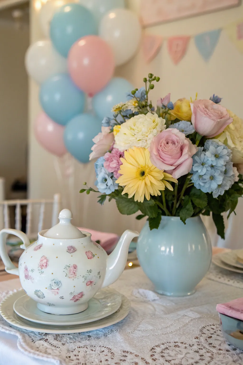 Incorporate balloons in gentle colors within your floral centerpieces for a fun detail. It’s a joyful way to enhance height and color to your tables.