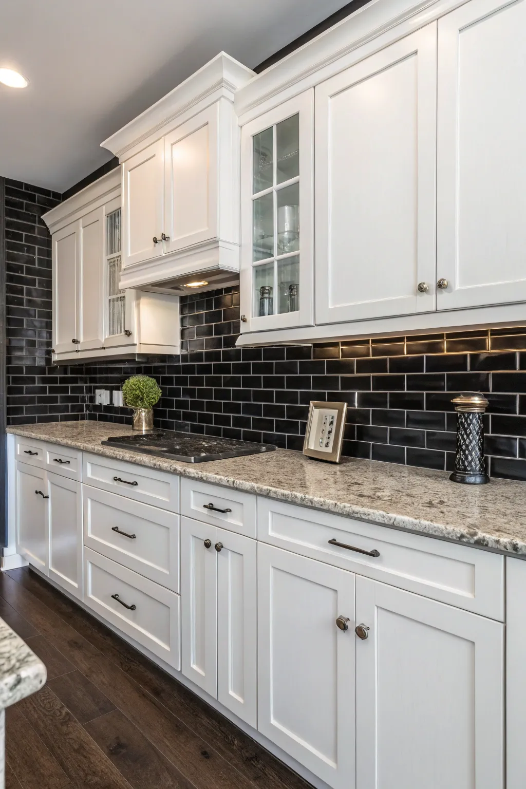 - Below-Cabinet LED Lighting Strips: Illuminate the dramatic contrast with below-cabinet LED lights, accentuating your stylish backsplash.