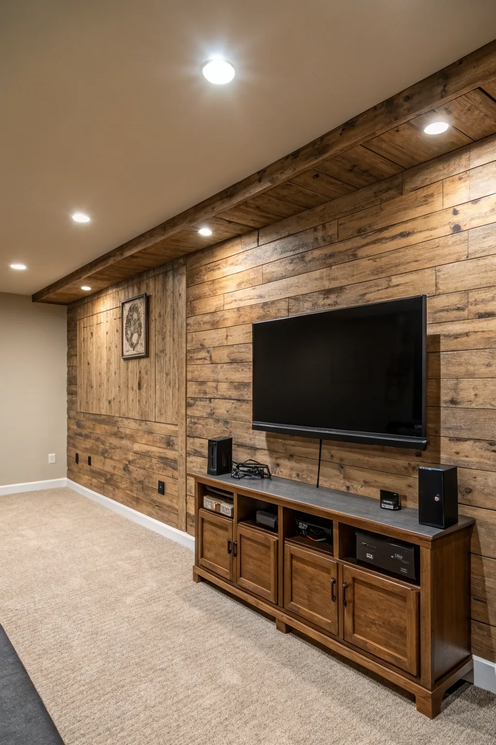 Contemplate a structured highlight partition employing salvaged timber or rock to impart a captivating point of interest to your TV vicinity. In a past endeavor, the innate textures infused comfort and richness into the basement.