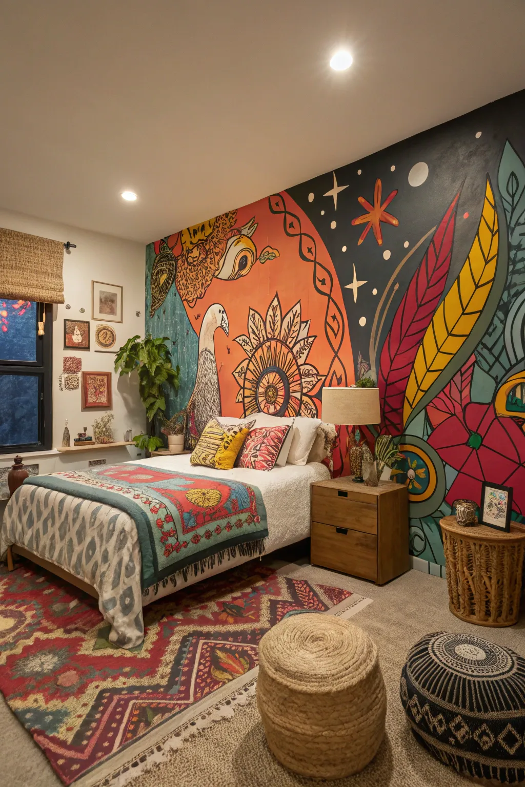 Diverse decor blends bring a uniquely personal vibe to your artistic bedroom.