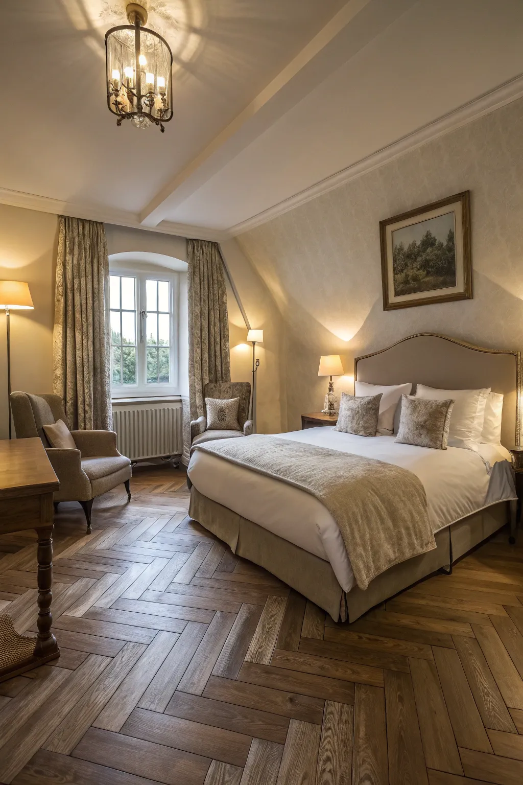 - Chevron Wood Flooring: Transform your bedroom with these elegant herringbone wood tiles for a timeless appeal.