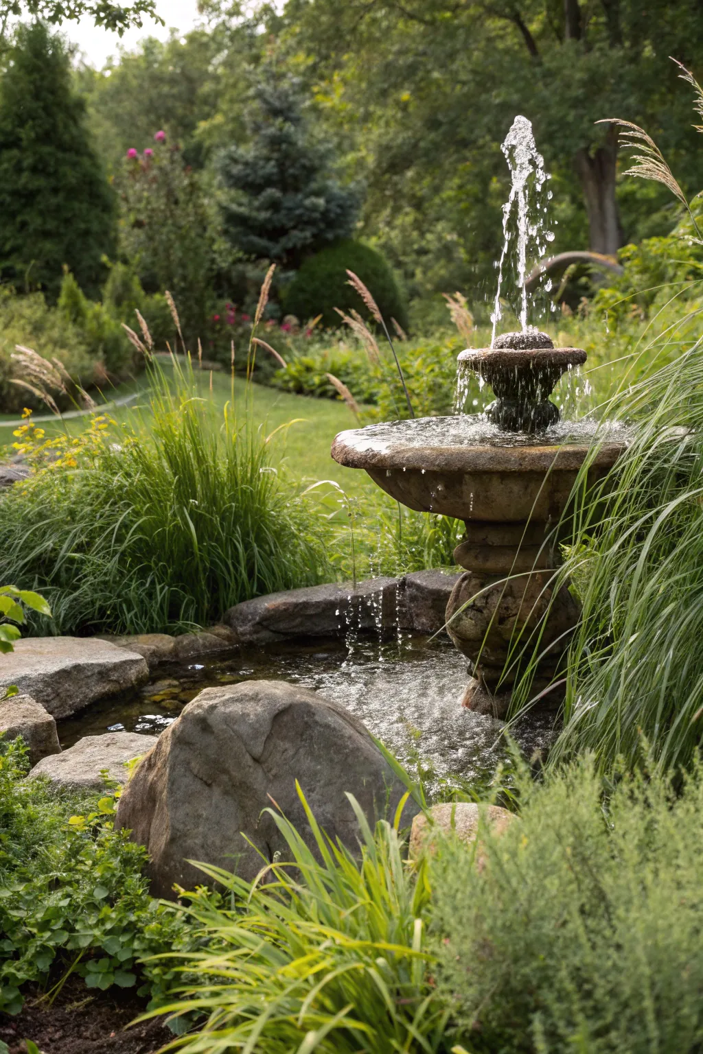 - Lush Ornamental Grasses: Select tall grasses to frame your fountain, offering privacy and a rich, verdant ambiance.
