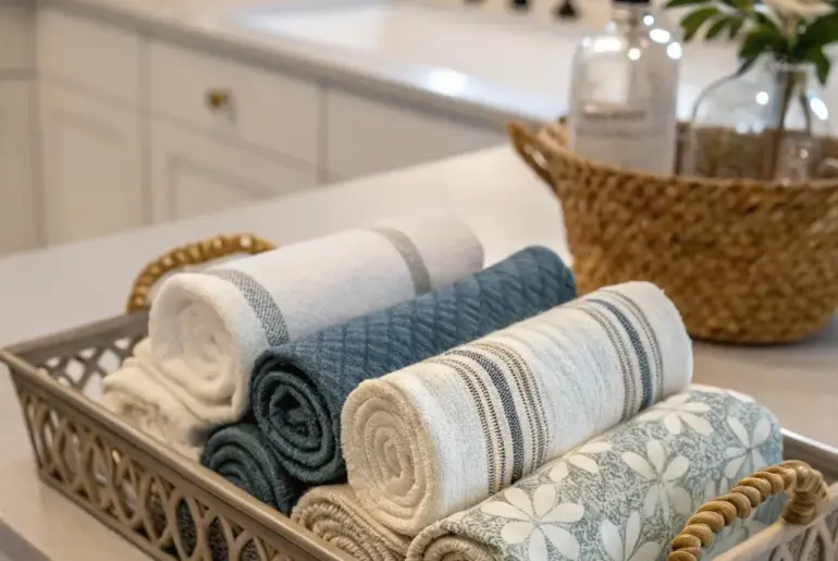 Kitchen linens are more than functional; they’re a chance to infuse your cooking area with charm. Let’s dive into creative ways to display these linens, adding a personal and stylish element to your kitchen. Rolled Linens in a Basket A basket display organizes linens with style. Roll your kitchen linens neatly and arrange them in an attractive basket on your countertop. This keeps them accessible and organized while enhancing your kitchen’s style. These products might…
