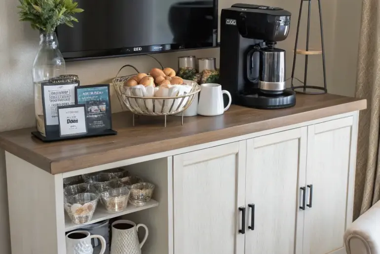 Establishing a special coffee and tea corner at home offers a chance to streamline your day while heightening enjoyment. Come, let’s uncover some delightful concepts to reimagine a nook in your kitchen or communal space into an attractive beverage sanctuary. Change a Locker Into a Setup Converting a closet into a coffee station maximizes space usage efficiently. A changed locker is extremely space-efficient. I appreciate the optimized usage. These products might be useful: Attached Board…