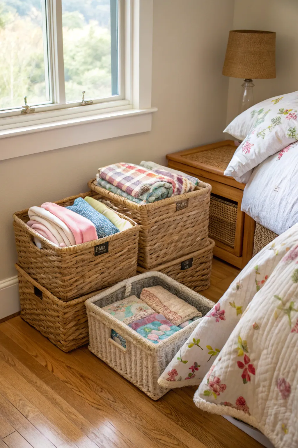 Comforters stored in wicker baskets in a bedroom corner, showcasing a cozy and well-organized space.