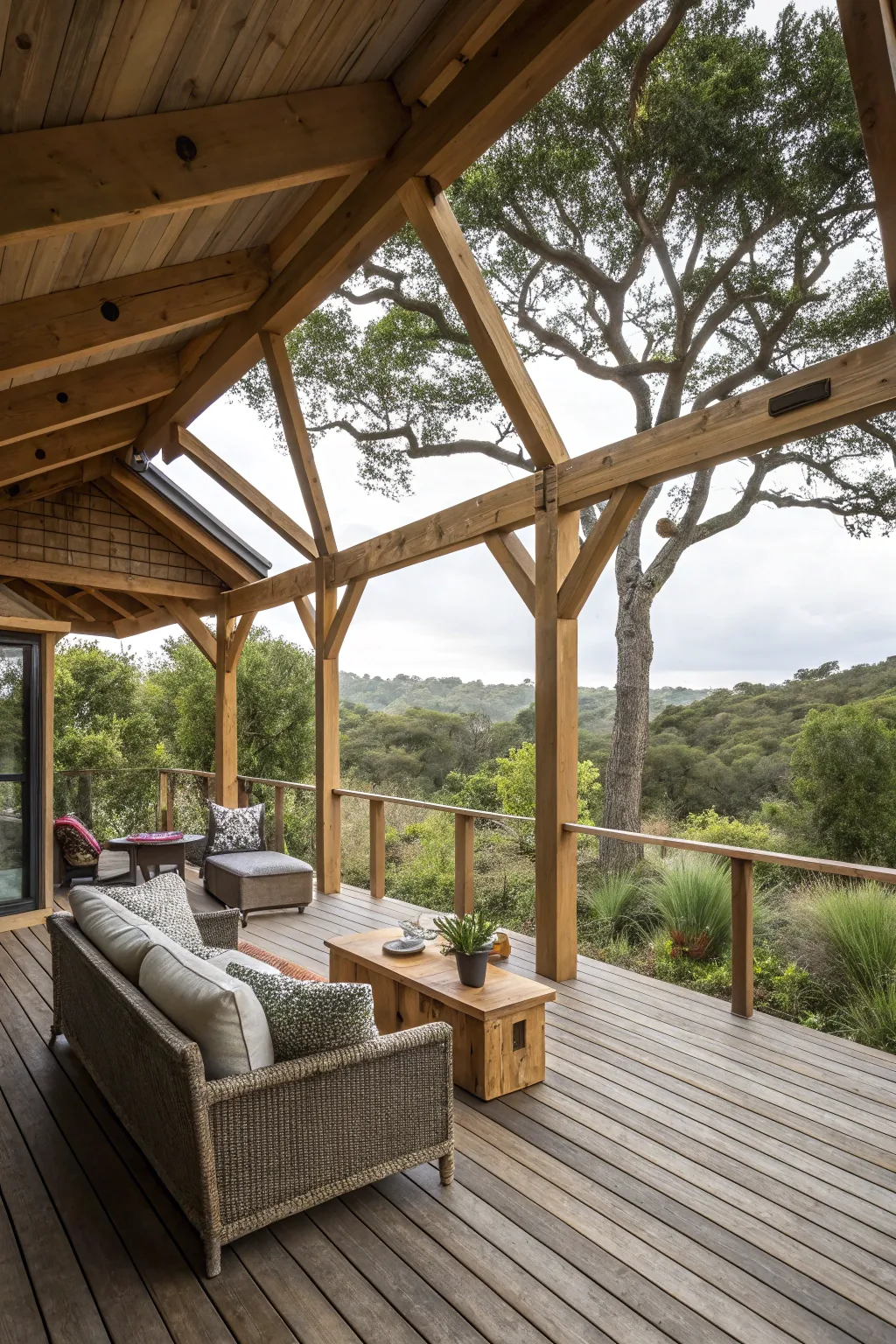 Wood frames add country elegance and strength to deck roofs.