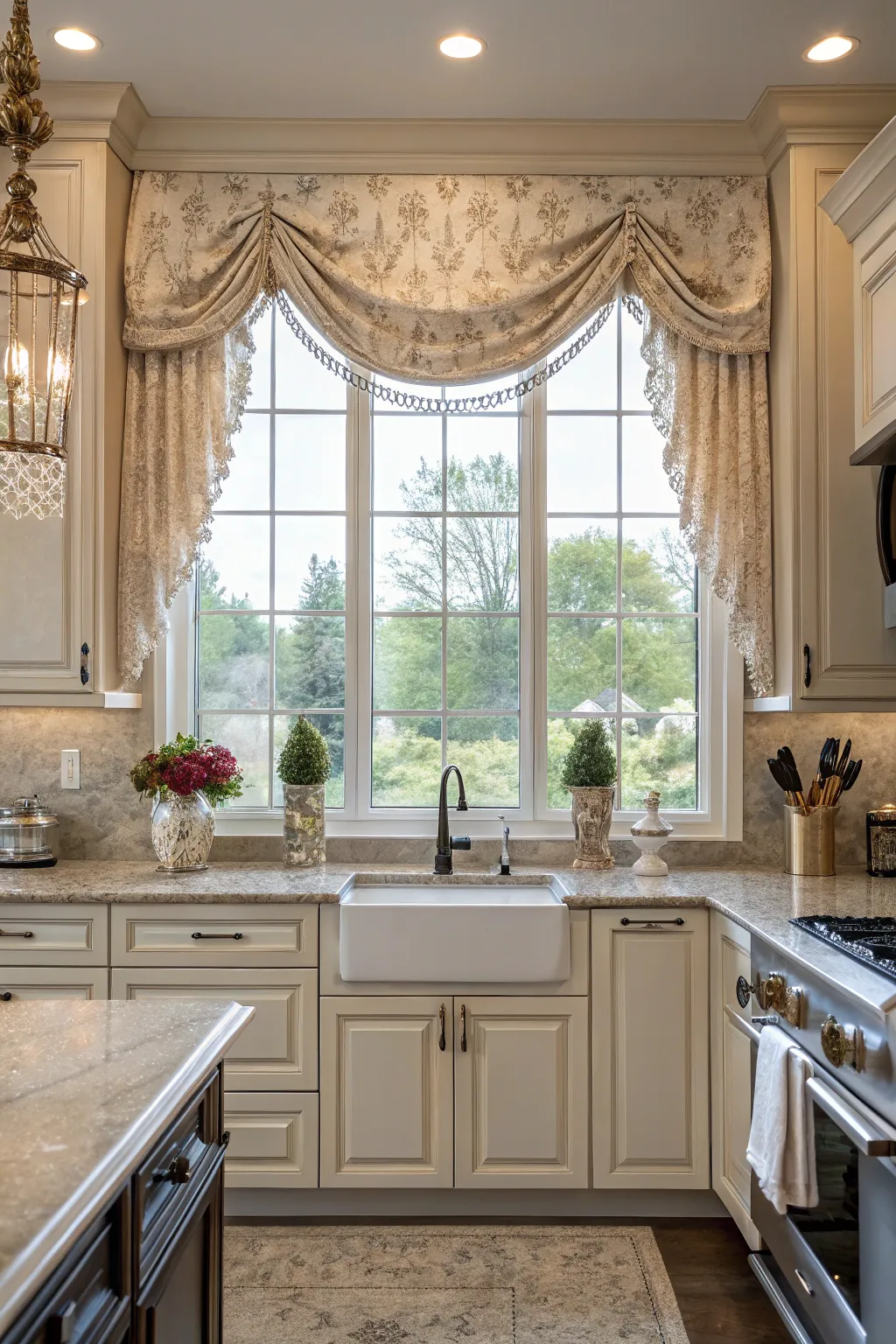 For a theatrical effect, consider floor-sweeping curtains if the area allows. They inject a touch of luxury and are a showstopper in any vast kitchen.