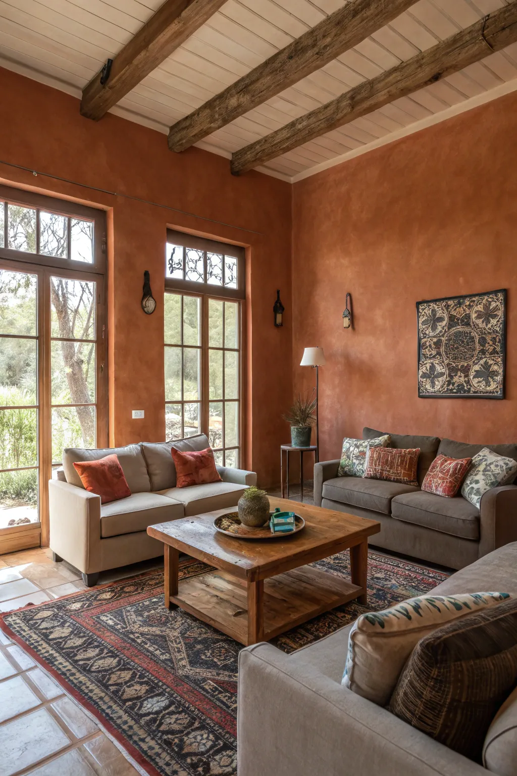 Fill your living space with comfort by utilizing earthenware shades that evoke sunlit Italian settings. I am captivated by the way these tones introduce a snug radiance to any space, rendering even the murkiest nooks inviting.
