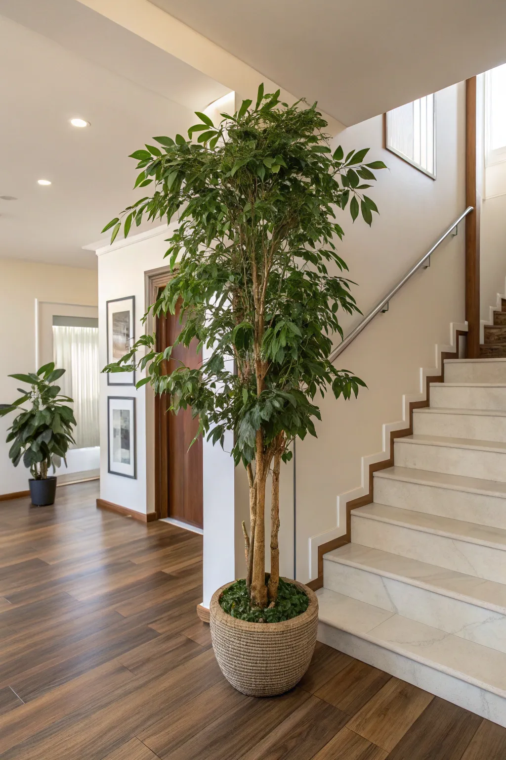 Incorporating greenery into your foyer can foster a rejuvenating setting. I am fond of having a towering plant that infuses vitality and dynamism into my entrance.
