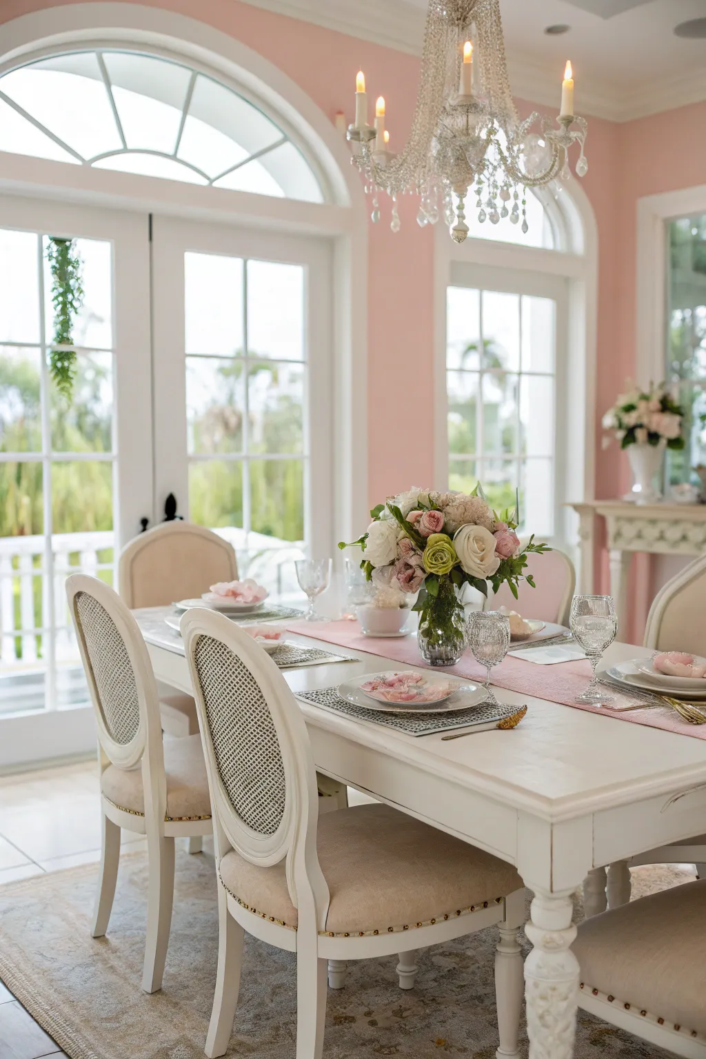 • Elegant Crystalline Chandelier: Illuminate your dining experience with a crystalline chandelier, adding sophistication and charm.