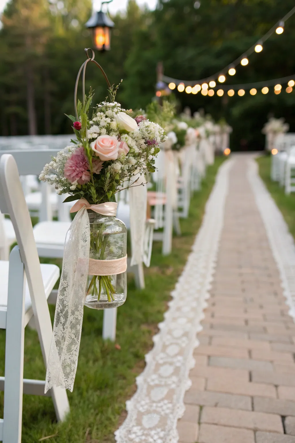 Affix artisan jars filled with blooms from the seating for an endearing, country-style aesthetic. This resonated remarkably well at a friend’s wedding, incorporating charm without significant expense.