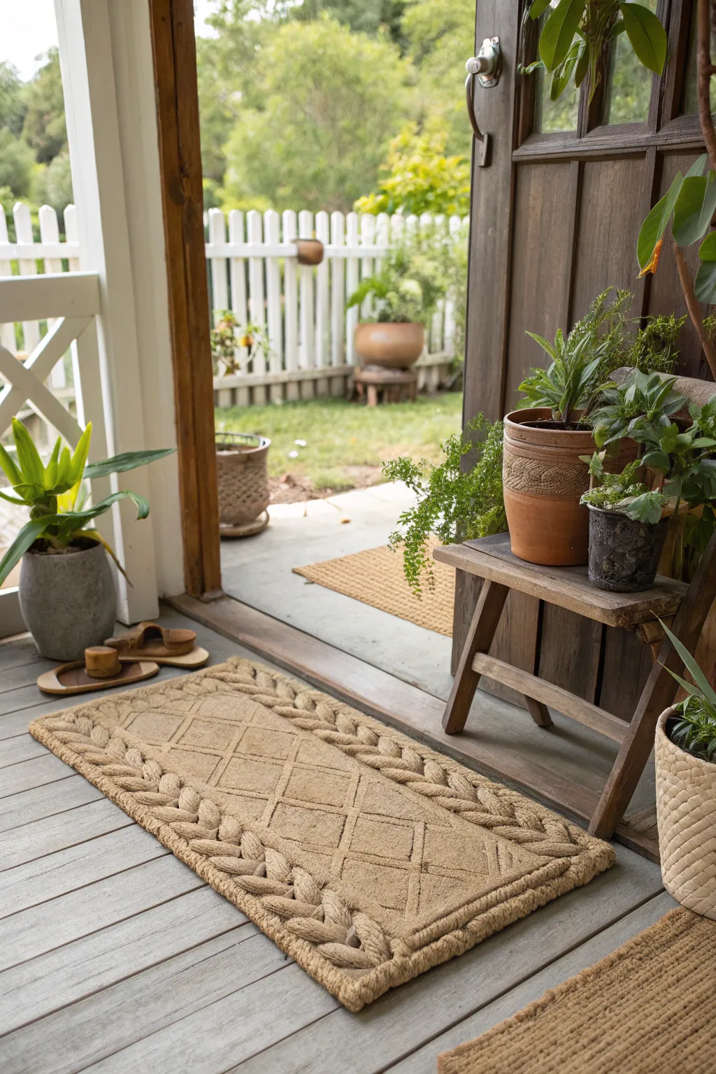 - Rustic Woven Basket Planters: Pair your front mat with stylish woven planters for a cohesive, rustic outdoor look.