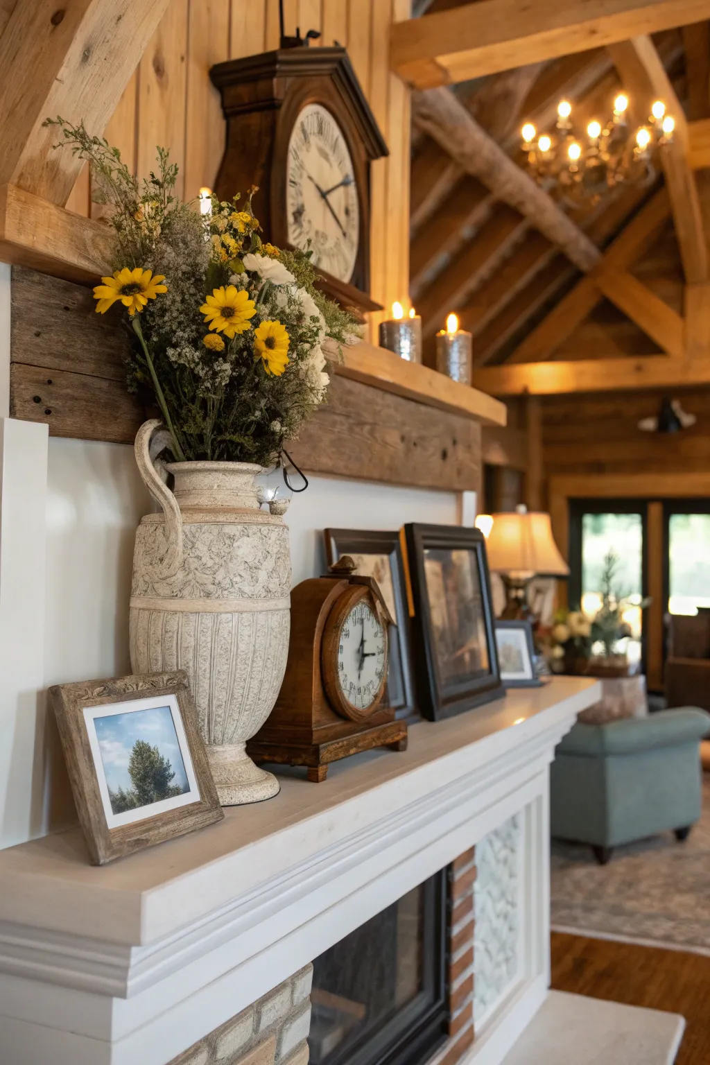• Repurposed Wood Mantel Display: Amplify your mantel’s appeal with a repurposed wood display, instantly bringing rustic warmth.