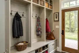 - Countryside Timber Seating with Storage: Bolster your mudroom’s coziness using a countryside timber seating unit offering style and storage solutions.