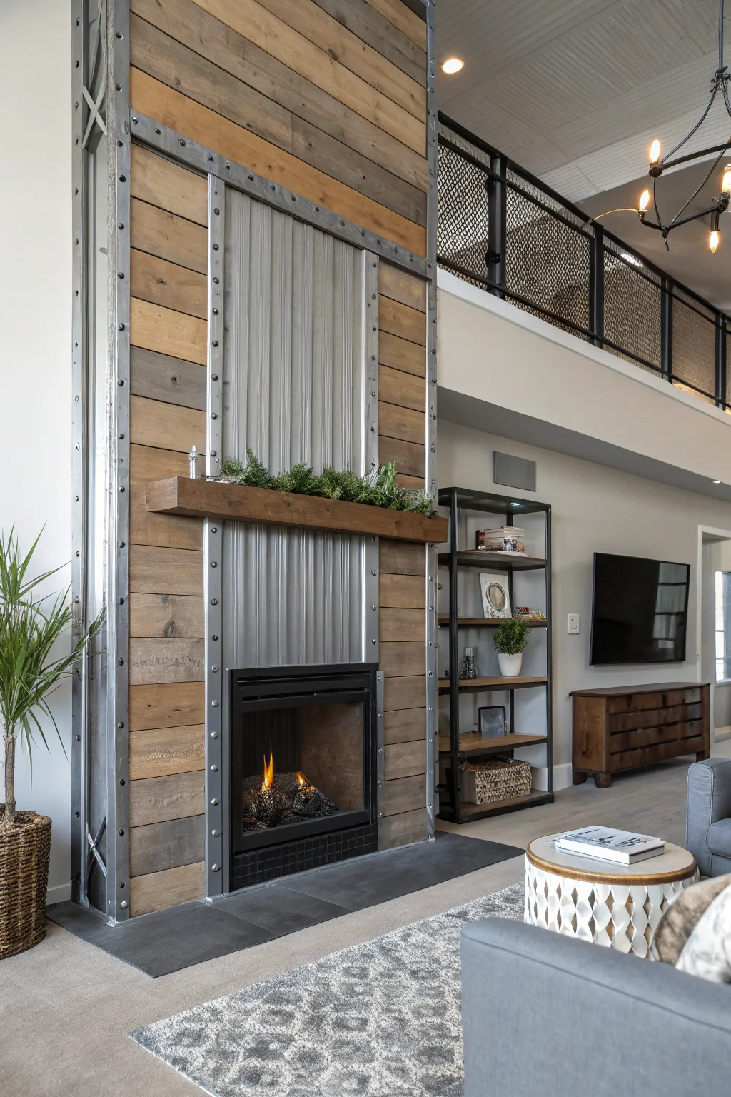 Blended textures, featuring steel and wood, amplify the richness of the shiplap fireplace.