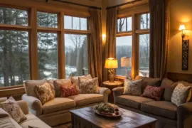 Incorporate earthy elements with timber shelves and a stone fireplace. This combination infuses warmth and a hint of rural charm into your space, making it feel welcoming and snug.