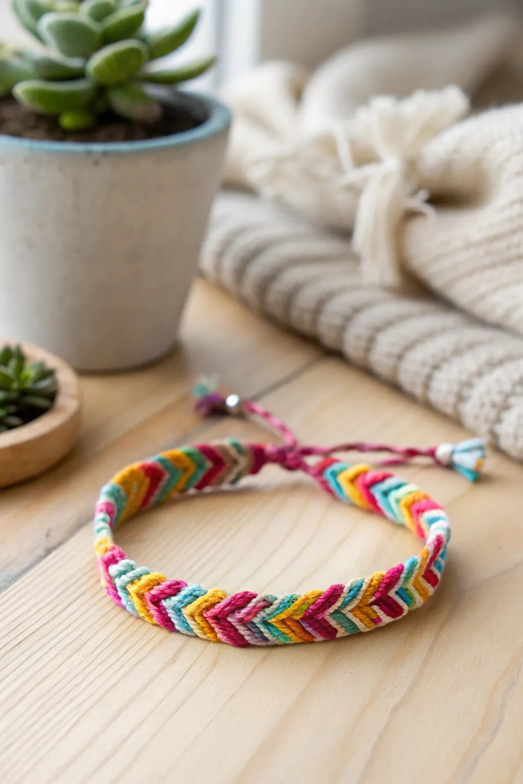 Develop panel shade patterns for a modern take on the classic friendship bracelet. Combining bold colors in chunky segments creates a striking statement piece.