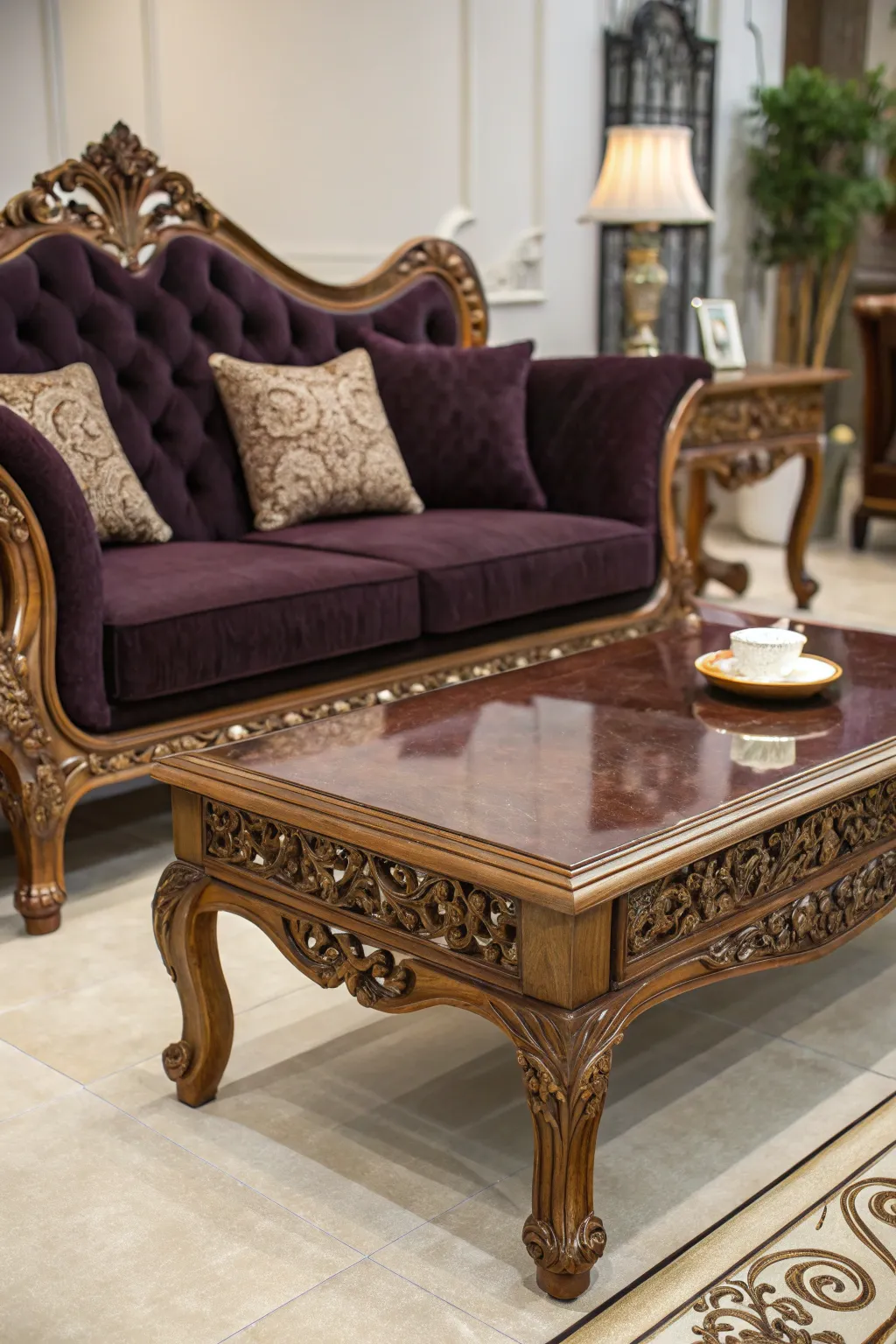 - Opulent Couch with Sculpted Lumber Outline: Transform your area using this deluxe plush couch showcasing exquisite carvings to achieve a dramatic effect.