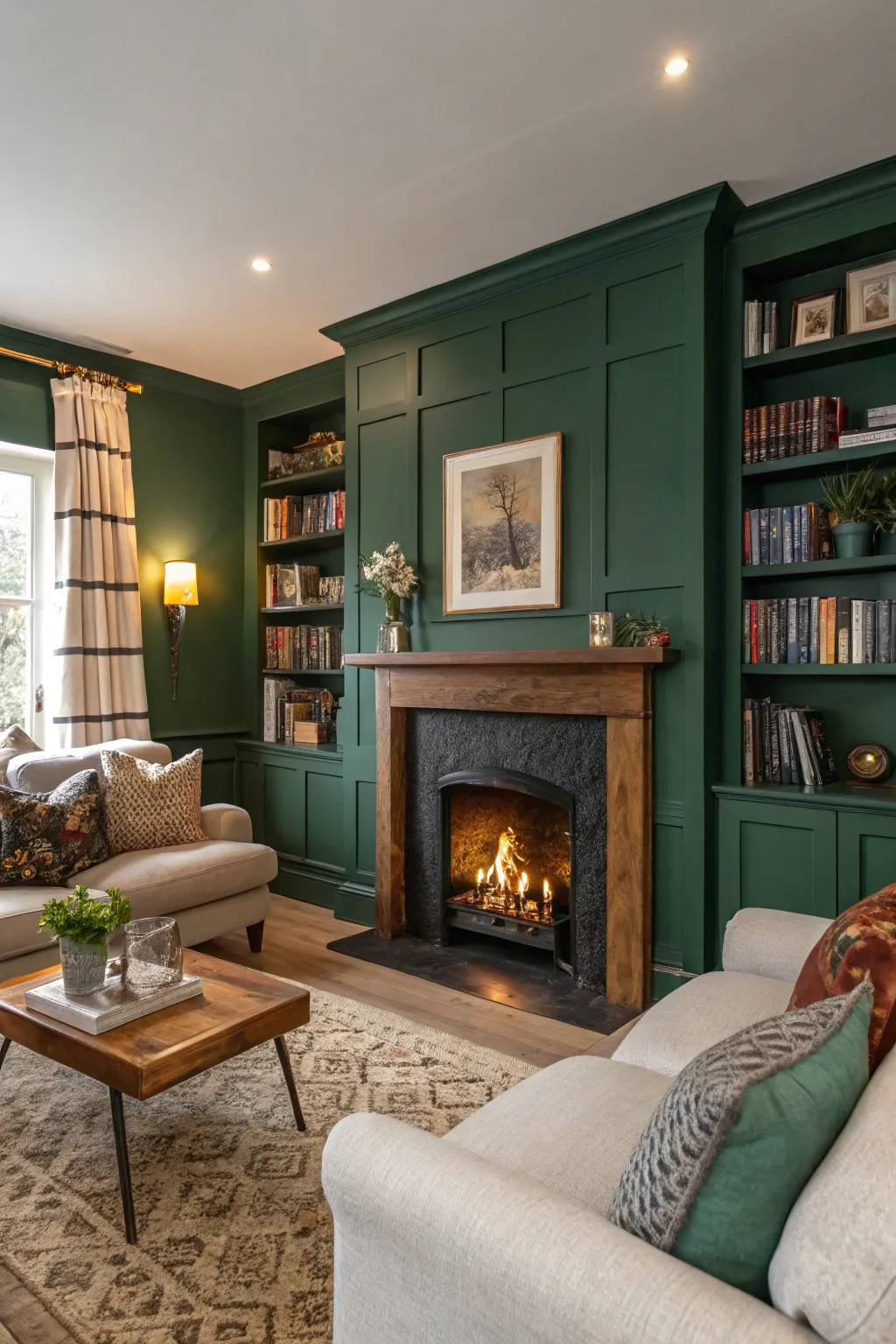 A woodland green feature wall located behind your fireplace adds both depth and visual impact. This strategy has helped me transform the fireplace into the room’s visual anchor.