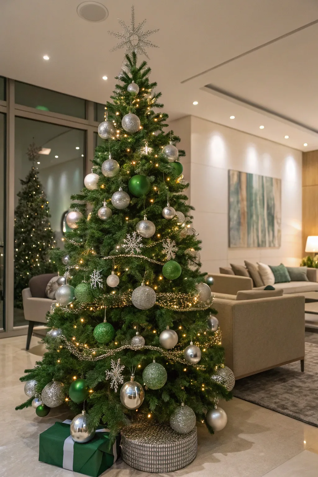 Impart some shimmer by interlinking green and silver ornaments. This pairing endows your tree with a contemporary and celebratory nuance.