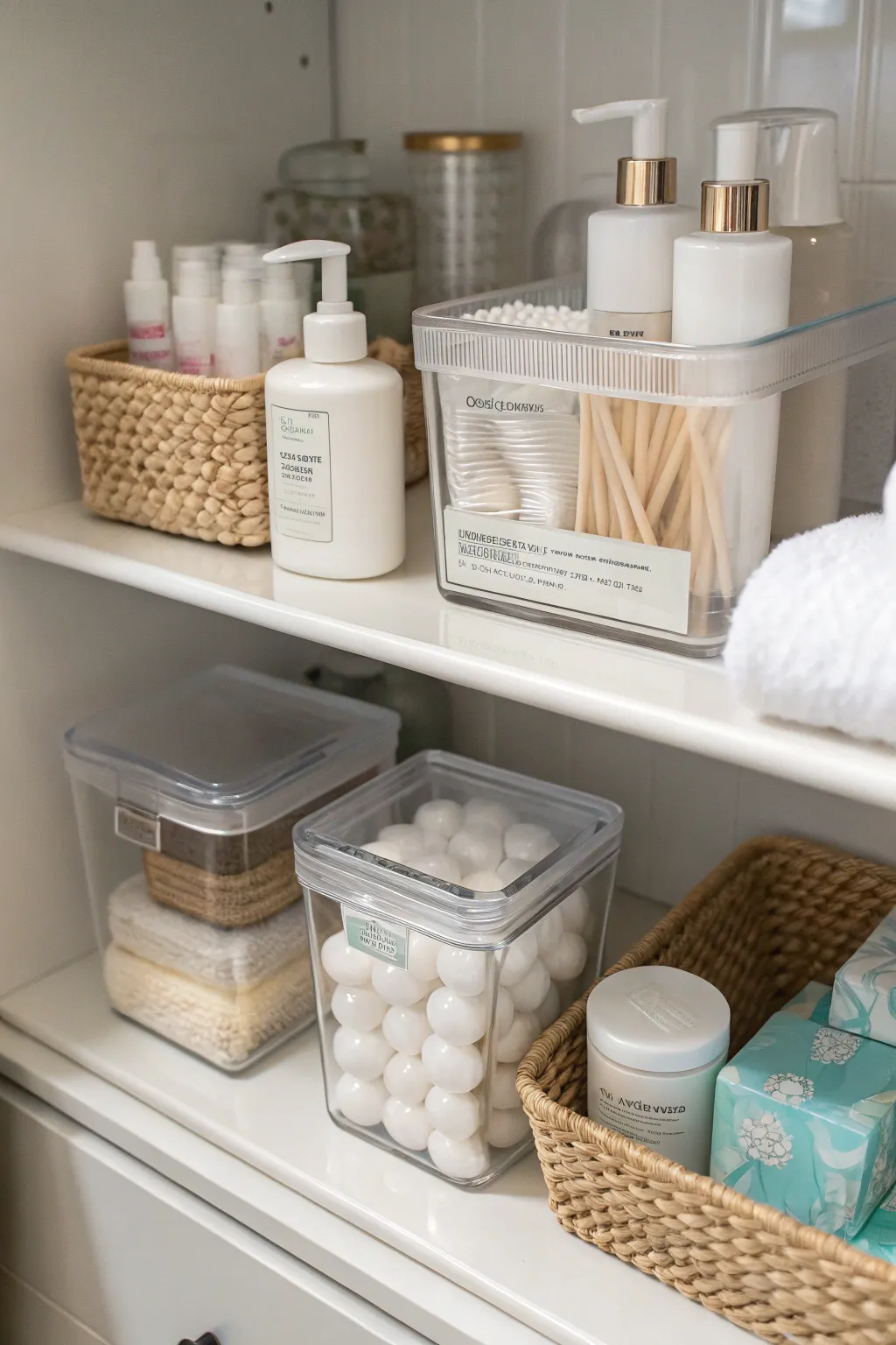 - Resin Storage Totes with Labels: Enhance bathroom storage with resin totes featuring integrated labels for straightforward identification.