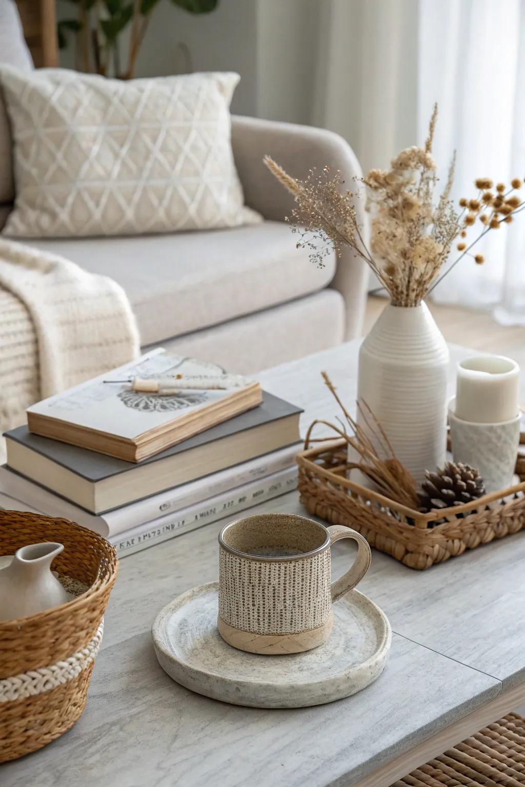 • Pottery Mug Set with Earthy Hues: Adorn your coffee table with stylish pottery mugs, giving a hint of simple sophistication.