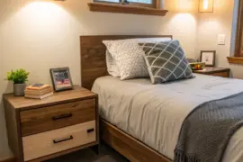 - Compact Bedside Unit: Get the most out of your layout with a slender bedside table where you can place your essentials and decorations.