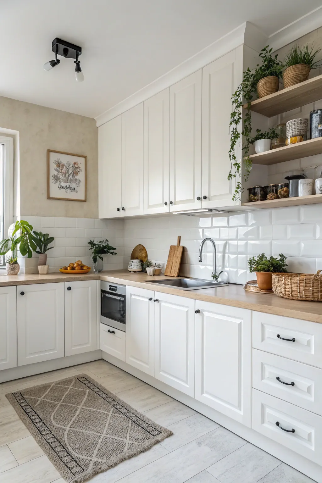 Choose a radiant and light color palette to create a welcoming and fresh atmosphere. Whites and gentle neutrals make your kitchen feel more spacious and inviting.