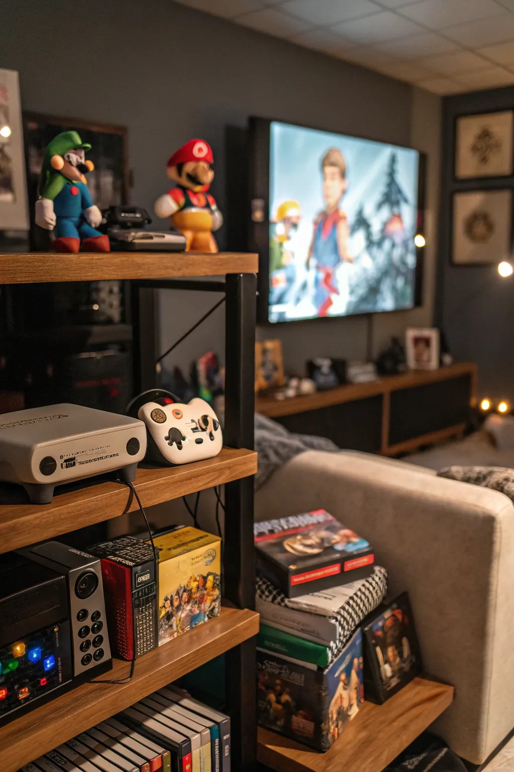 • Surface-Mounted Shelving Modules: Organize your games and consoles with sleek, space-efficient, surface-mounted shelving.