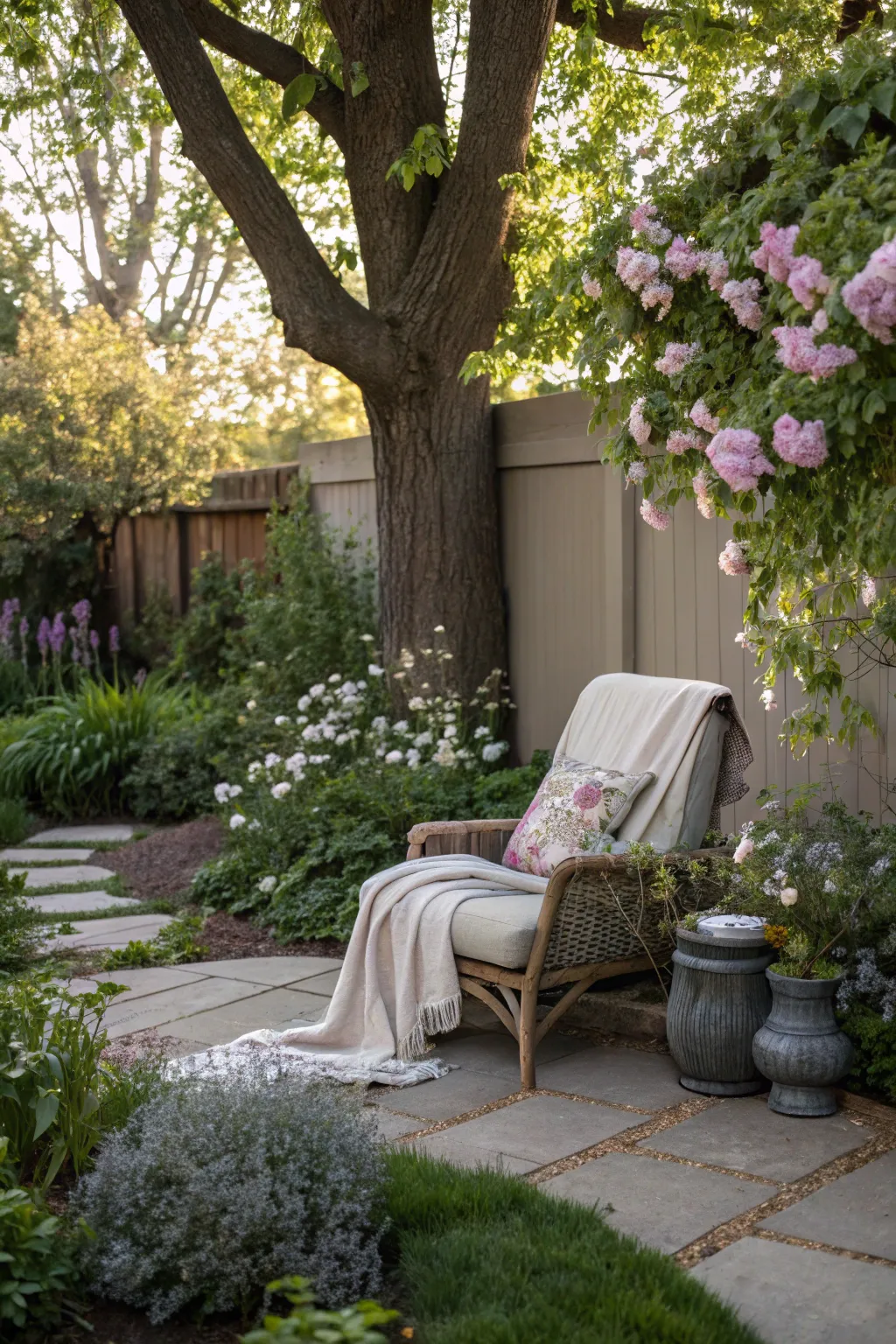 Design a cozy garden nook, using trees as a natural backdrop for relaxation and reflection. My personal retreat is a haven where I rediscover tranquility and nurture creativity. It gives a relaxing mood!