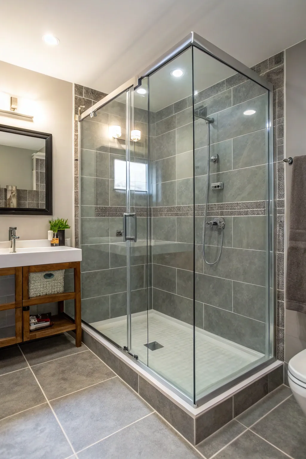 A frameless glass bathing area maintains an unobstructed and airy perception in your washroom. It perfectly assimilates with the gray and white motif.