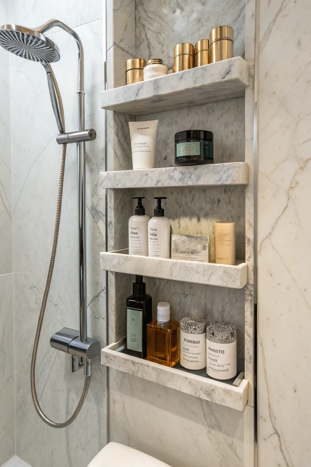 Why limit yourself to one when you can enjoy two? A multi-level stone alcove provides considerable storage while preserving a streamlined design. It is an excellent solution for maintaining organization without clutter.
