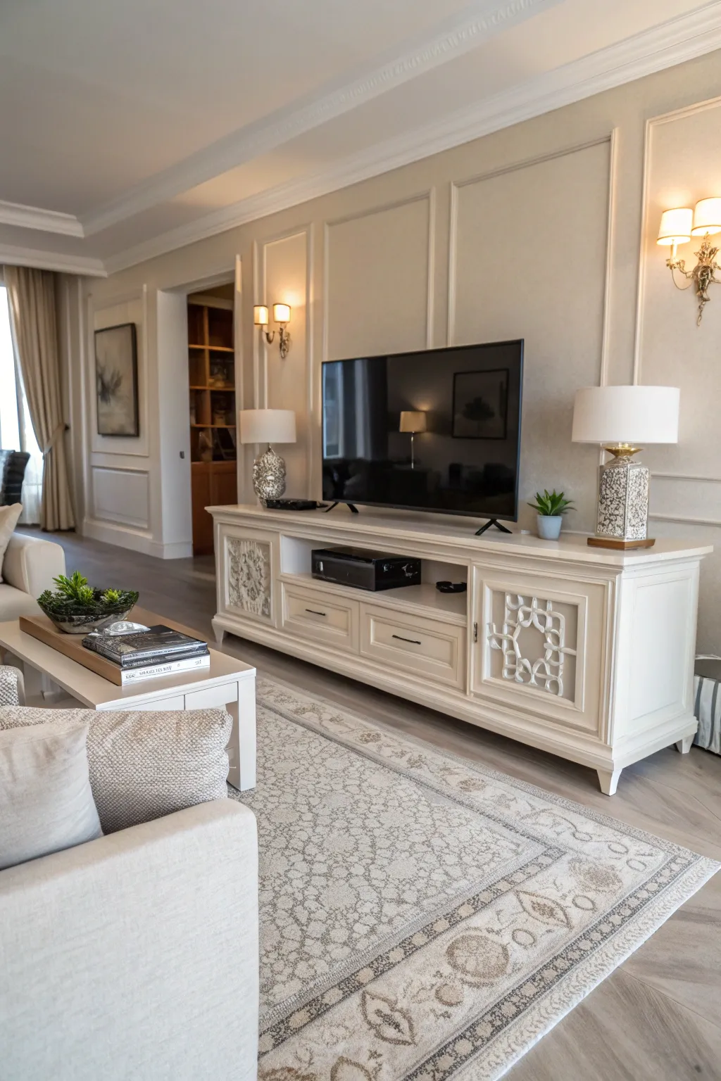 • Elegant Table Lamps: Add elegance to your room using matching lamps that enhance your TV stand’s symmetry.