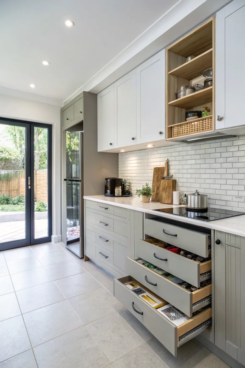 Amplify your stow by integrating concealed sections and effective organizational attributes. This guarantees a neat food prep zone without surrendering accessibility.