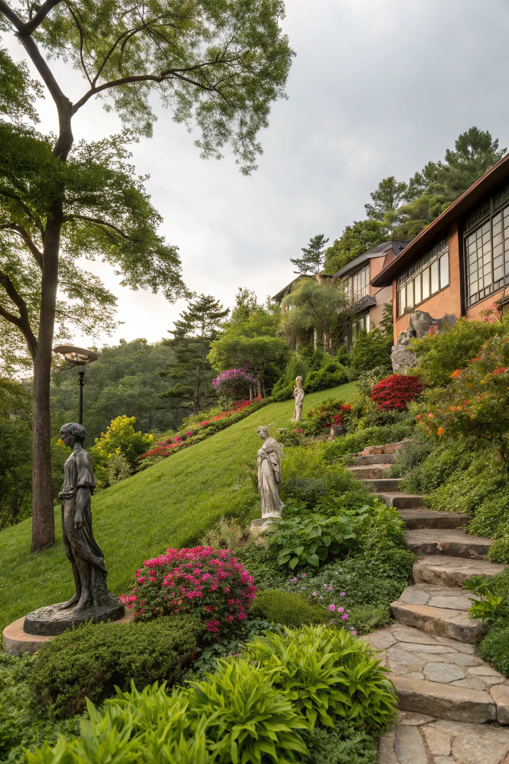 Sprinkle artistic sculptures or displays on your slope for a hint of whimsy and personal flair. These items can turn into focal points within the garden.