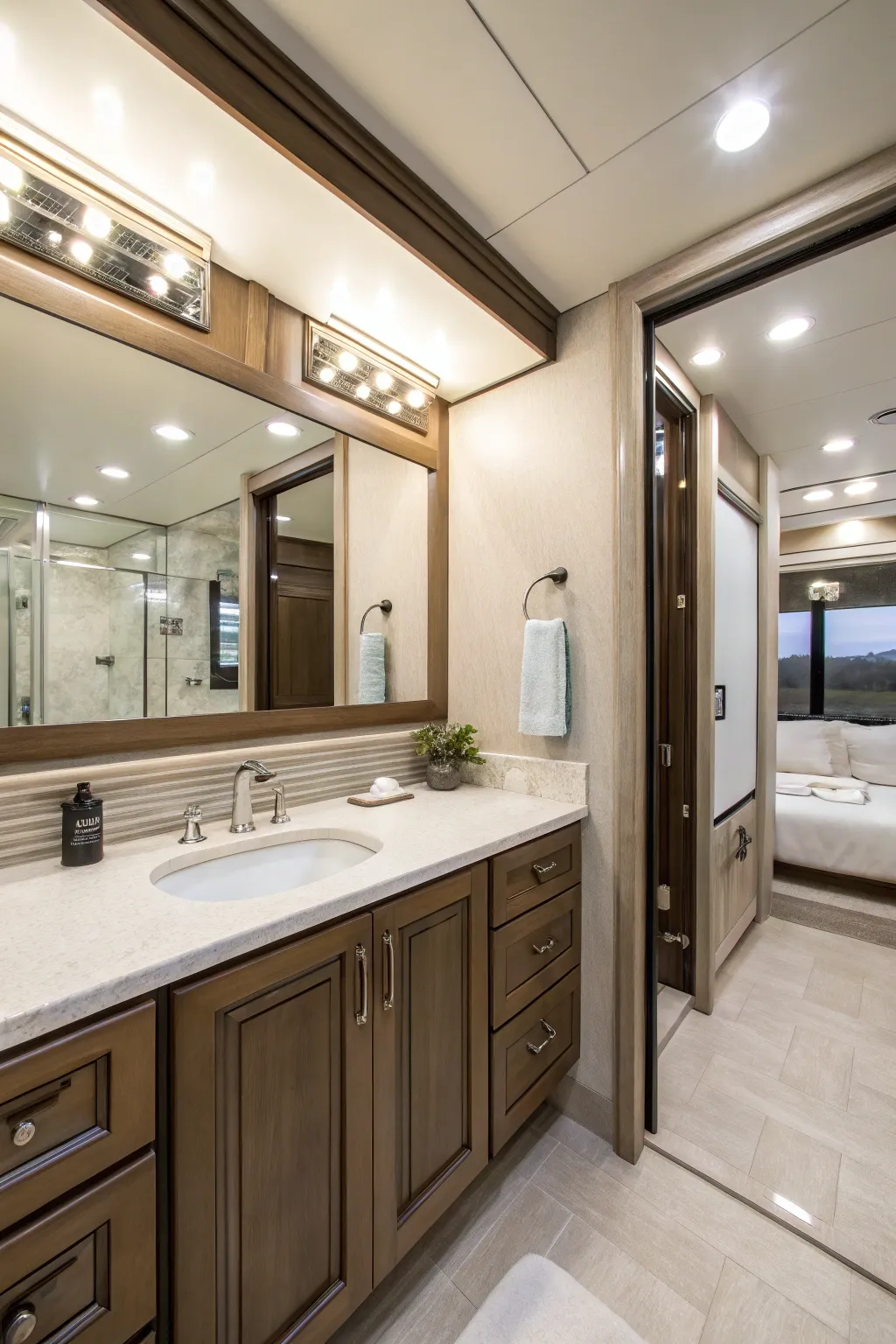 Amplify space with an elegant, wall-attached vanity in your RV bathroom.