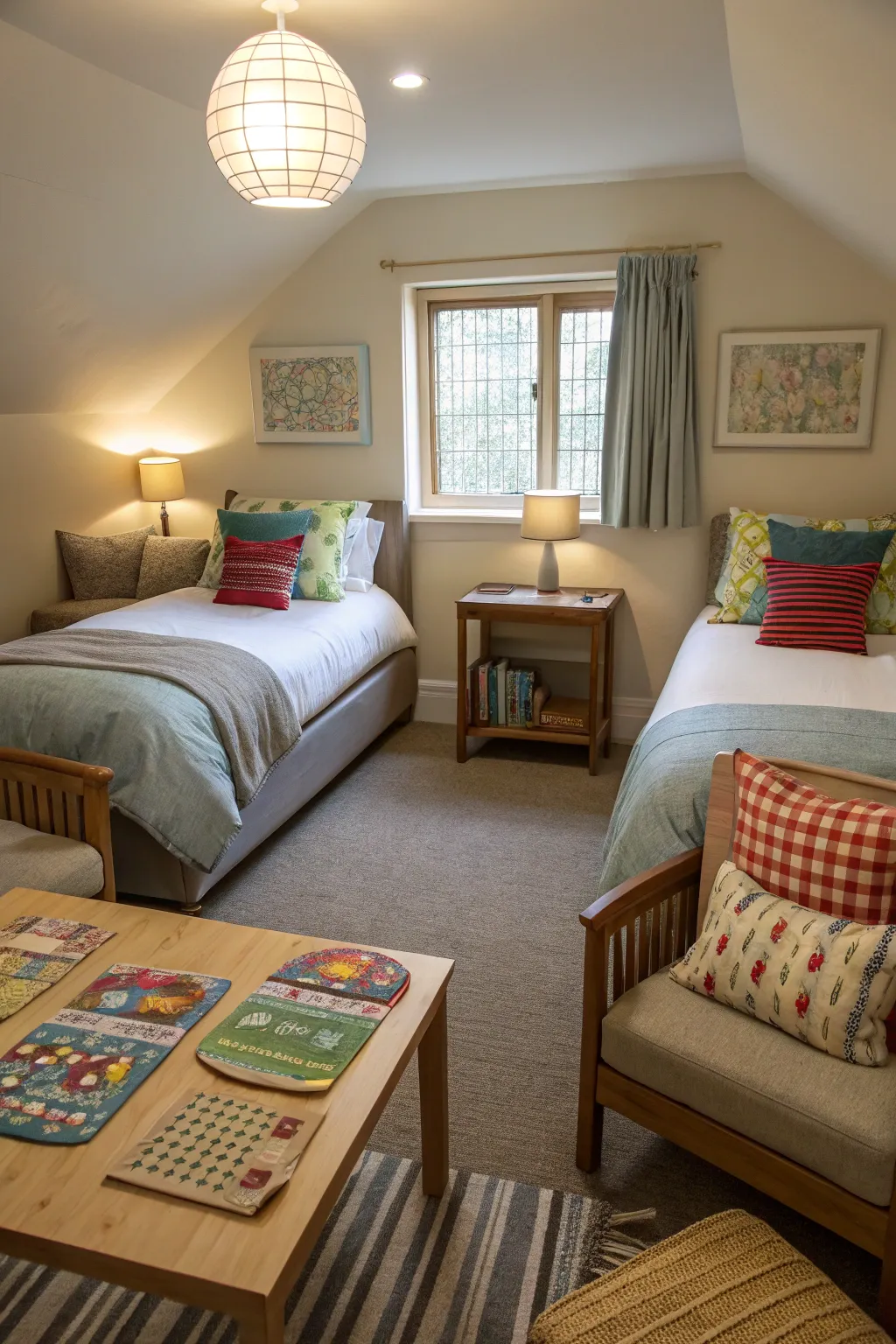 Pillows and cushions enhance the coziness of the twin bedroom.