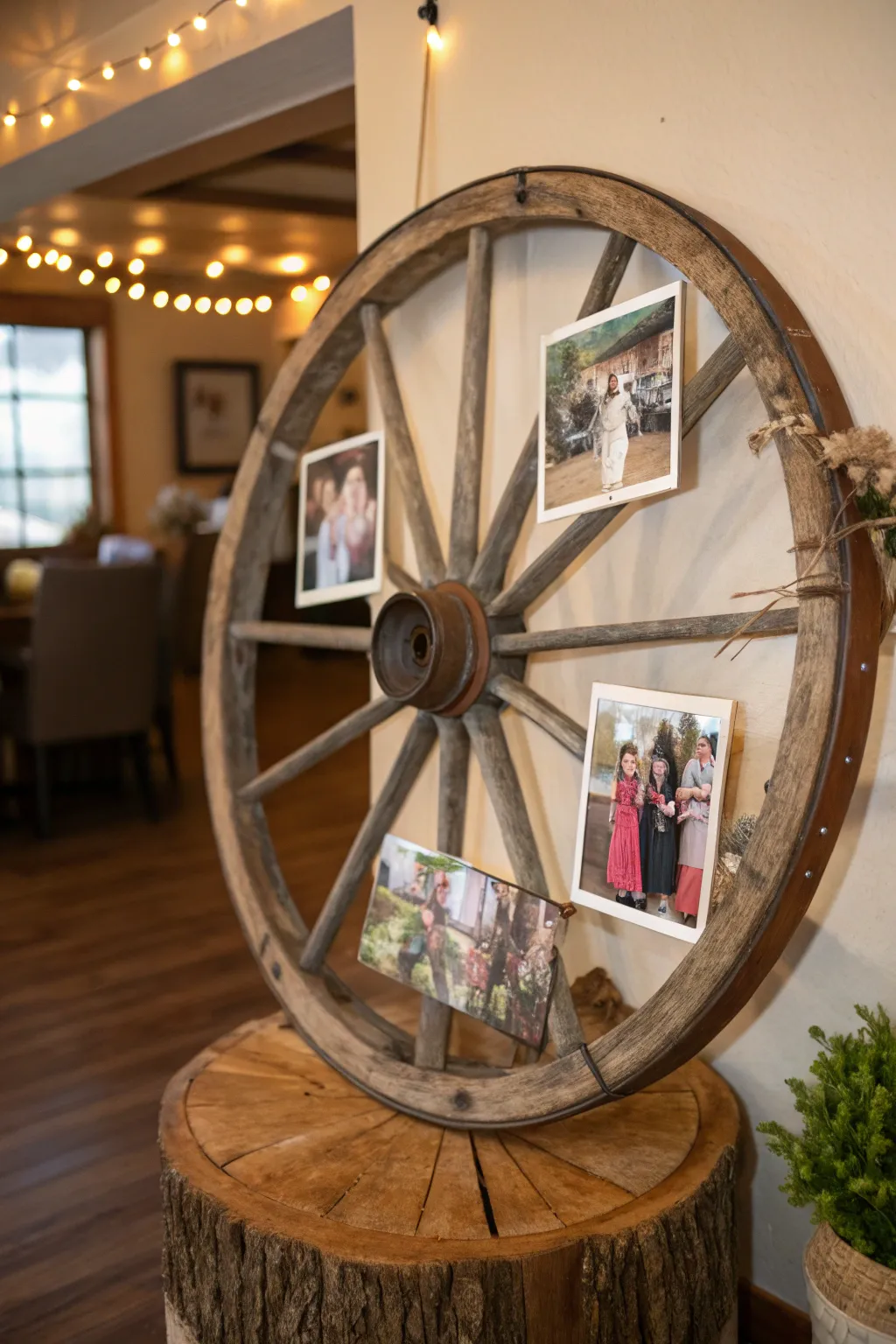 Attach photos to the spokes of a wagon wheel for a unique image display. This intimate detail has evolved into a beloved characteristic in my dwelling.