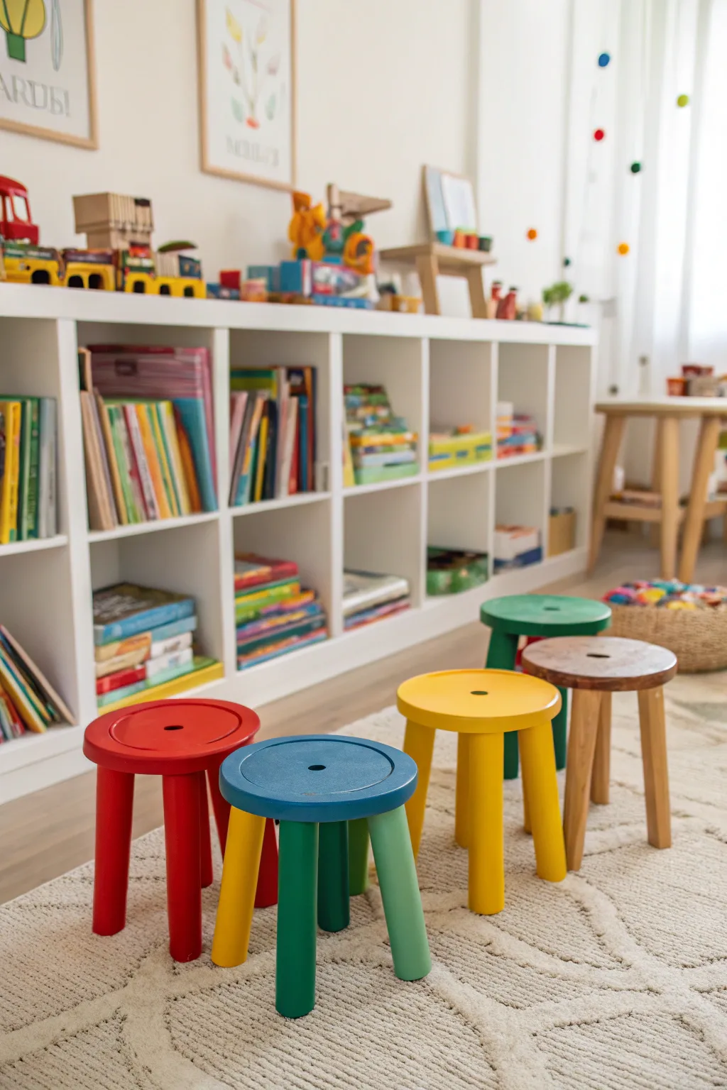 Make a fun sitting area for kids with vibrant wood stools. They are ideal for children to sit and play, echoing the happy chaos of a child’s imagination.