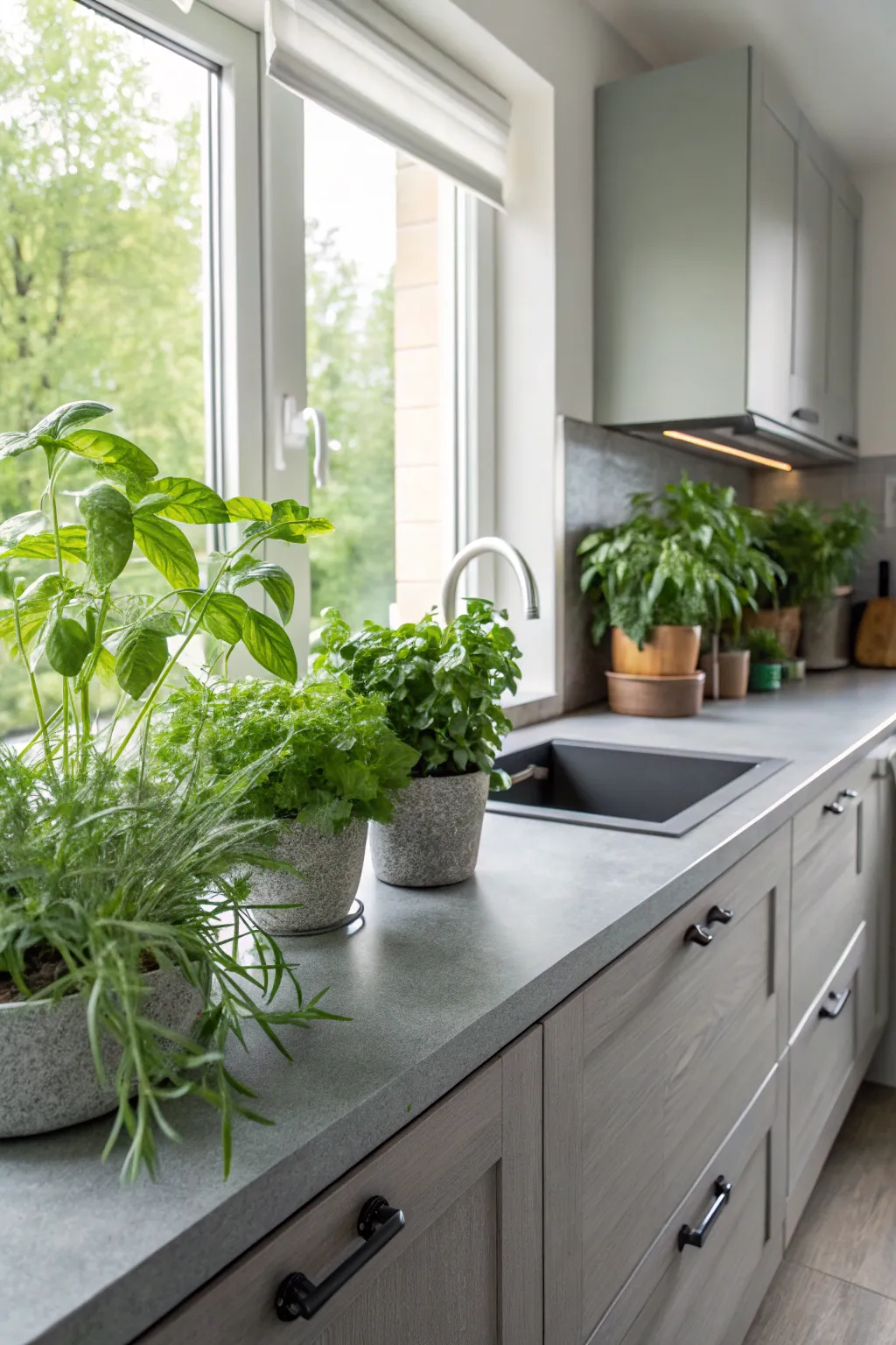 Incorporate vibrant plants with grey worktops to inject a hint of nature. The contrast is refreshing and adds vitality to the kitchen design.