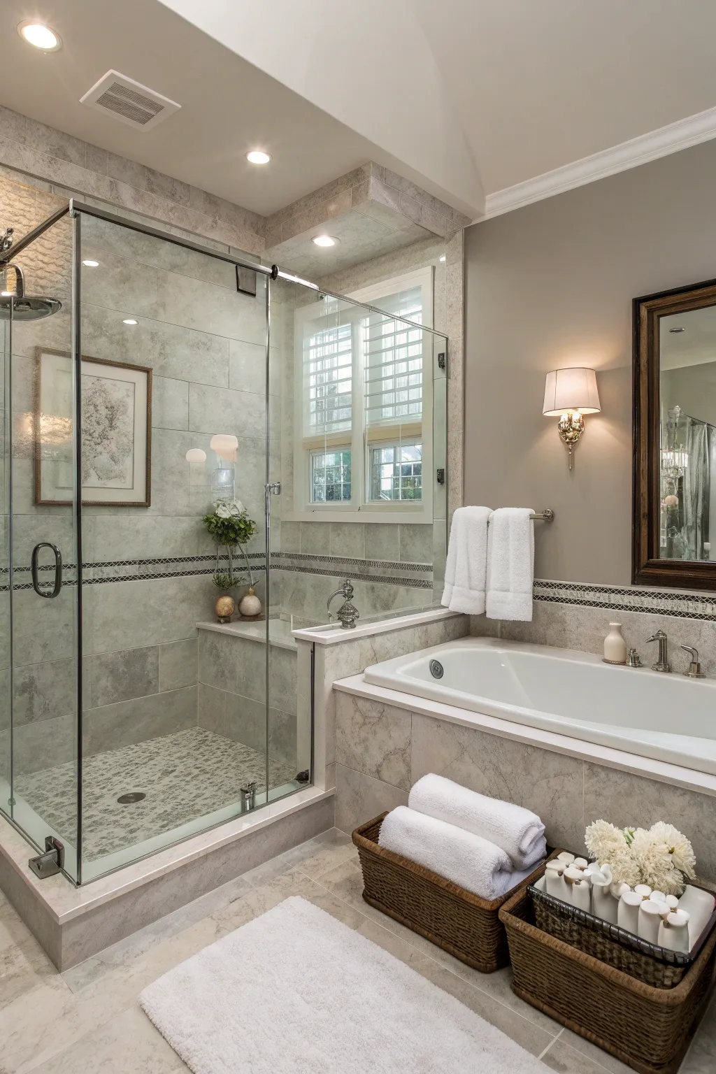 Establish a spa-like retreat by using calm whites and grays in your main bathing area. A full glass shower coupled with an under-mount tub can introduce luxurious tranquility.