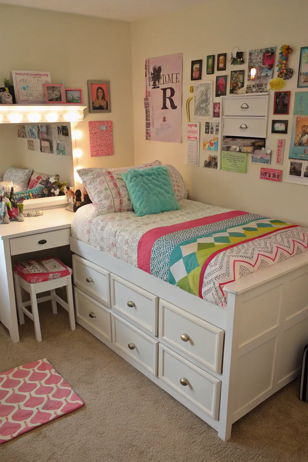 Go for adaptable furnishings such as a bed with storing drawers or a writing surface that can also serve as a dressing table. This boosts available space and functionality.
