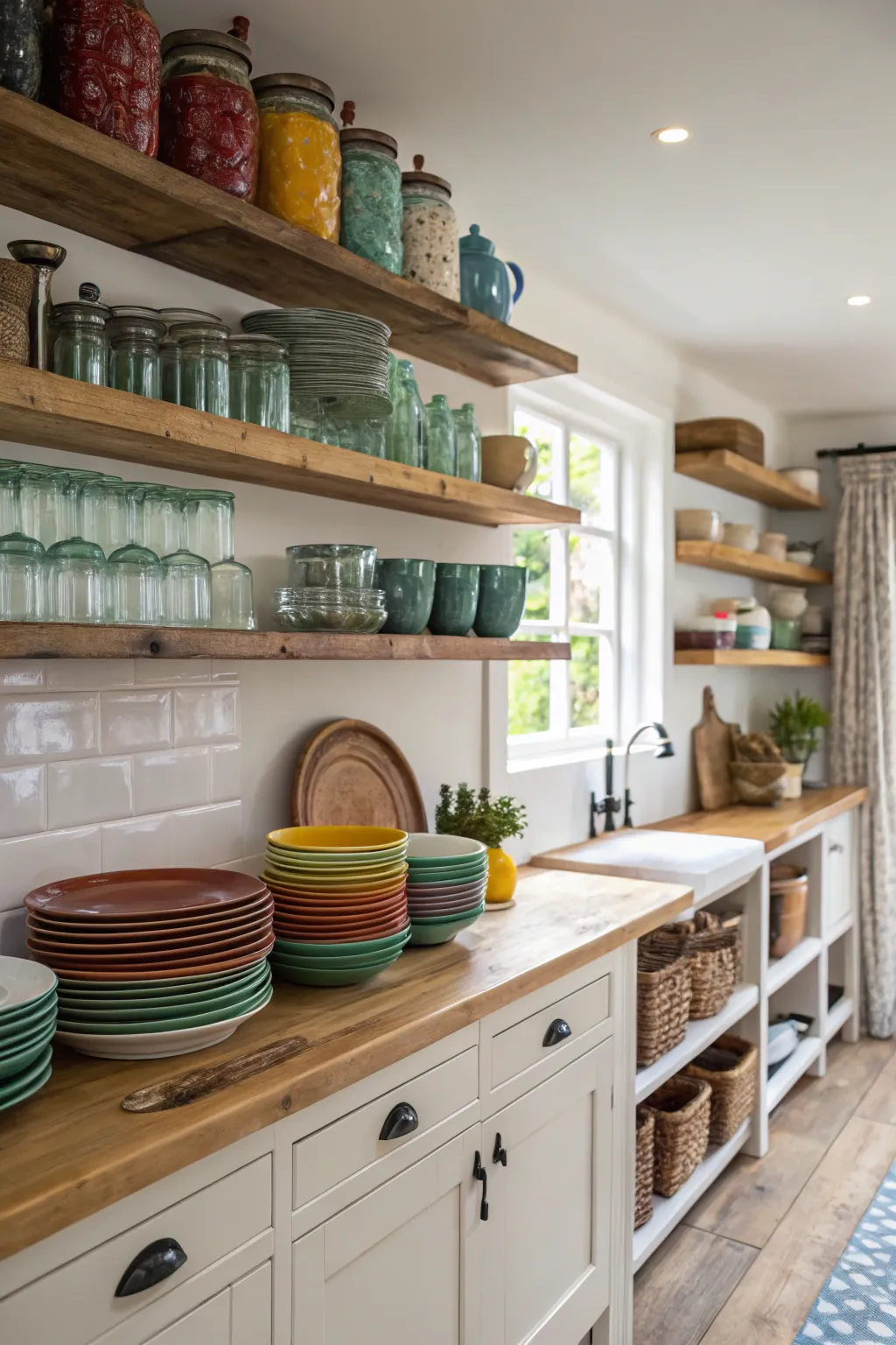 Substitute upper cabinets with exposed shelves for persona and ease. My exposed kitchen shelves exhibit charming vintage dishes.