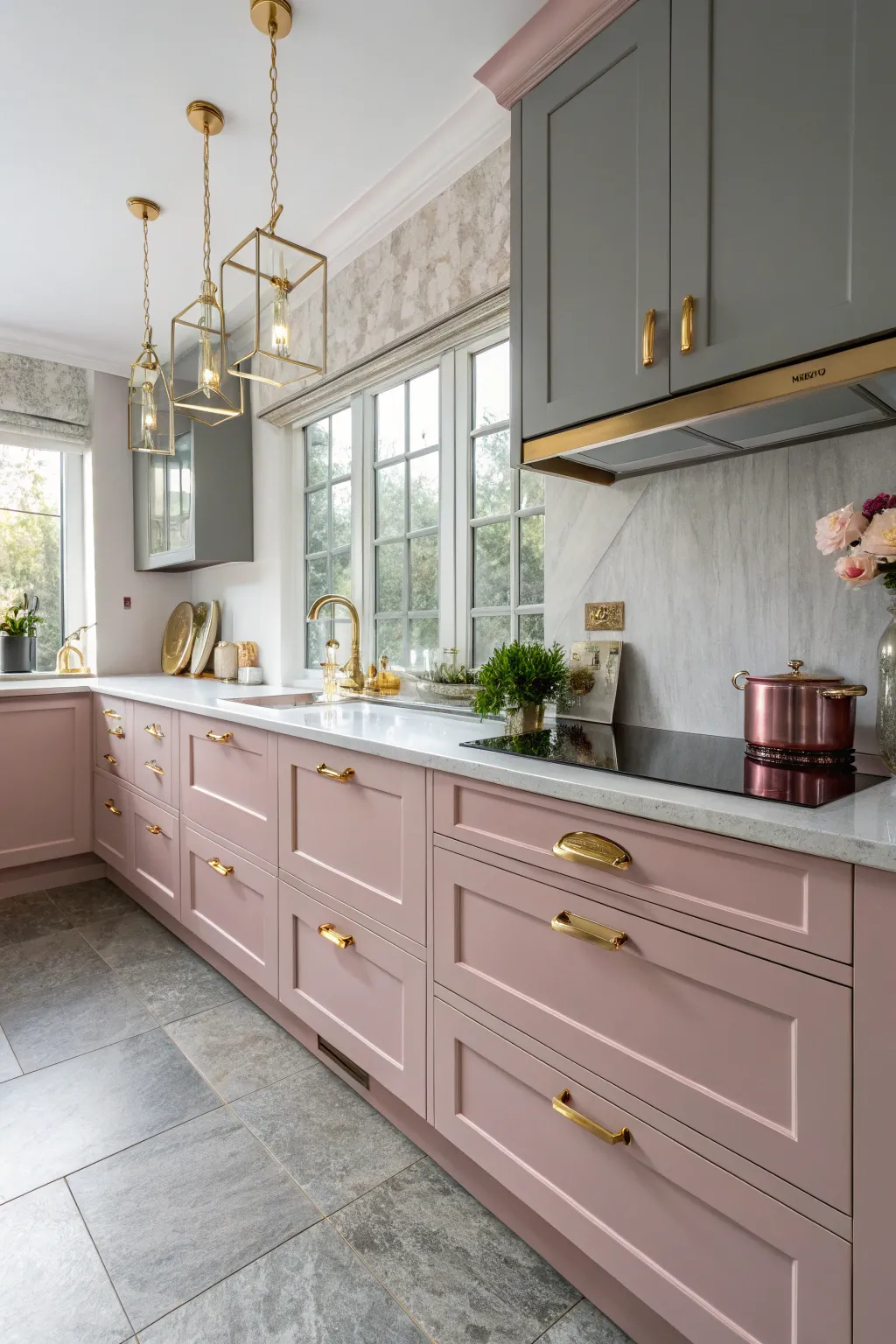 Incorporate metallic features such as gold to enhance the rose and grey theme. This provides a layer of refinement that, in my opinion, elevates any kitchen design.