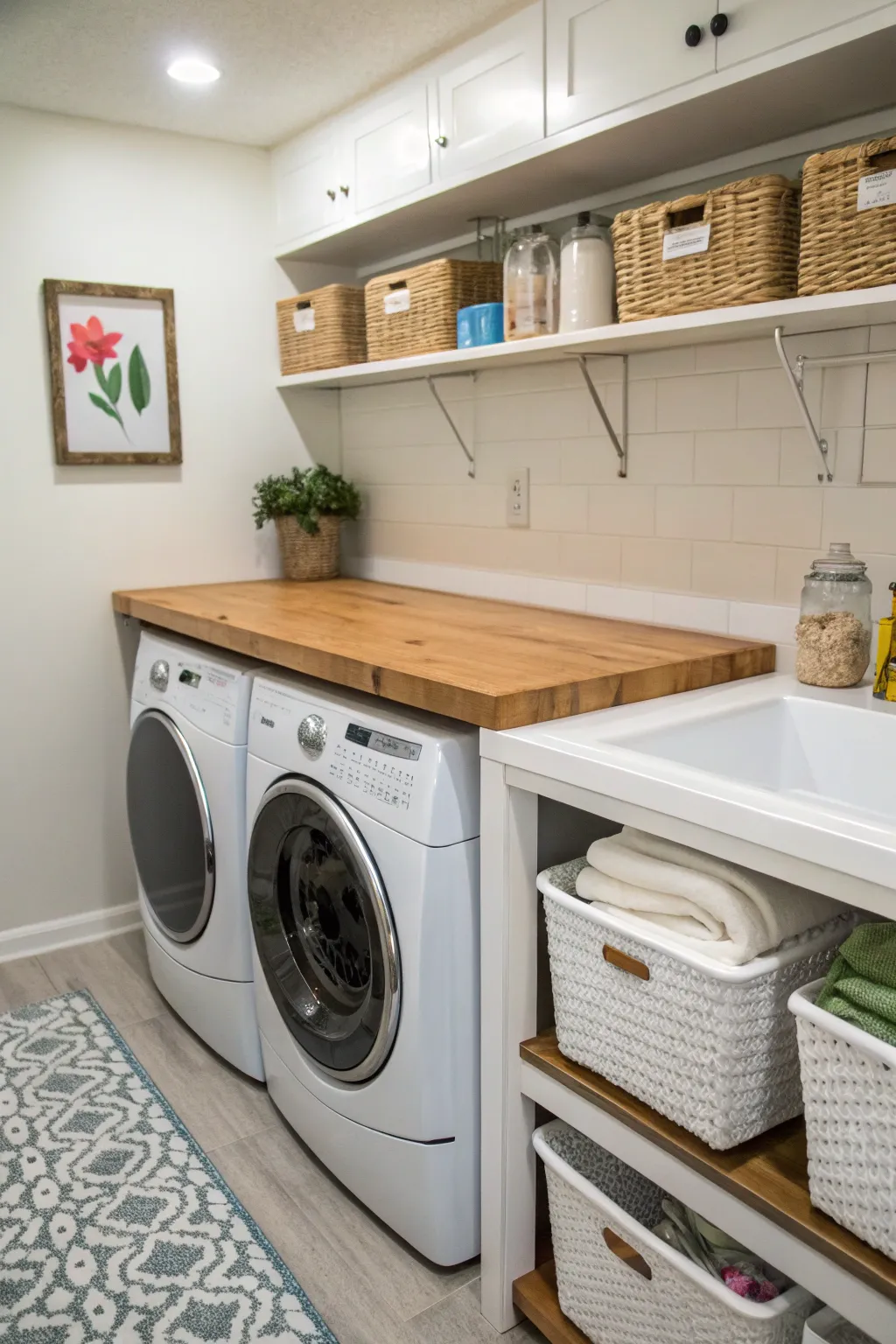 - Wood Block Work Surface: Introduce a cozy, organic element while also offering a sturdy spot for handling laundry chores.