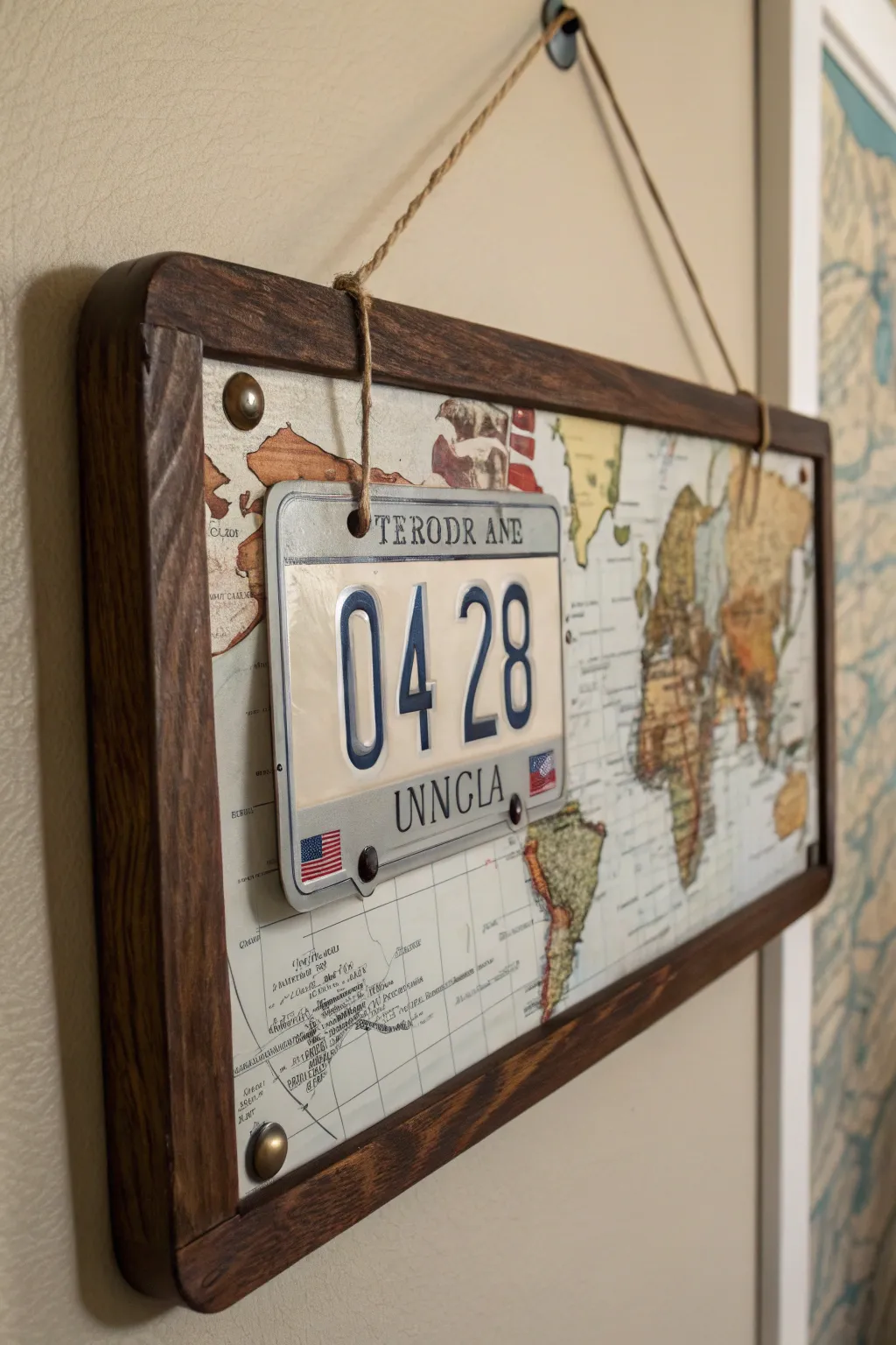 Transform a simple auto tag into a casing for beloved images or artworks. I used an old tag to frame a vintage map, and it looks amazing over my workspace.