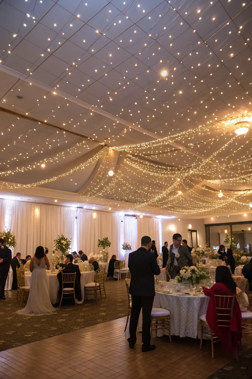 Adorn the ceiling with sparkle strands to mirror a celestial, starlit sky. I find that these lights weave a bit of wonder into any celebration spot, crafting a setting that feels both magical and intimate.