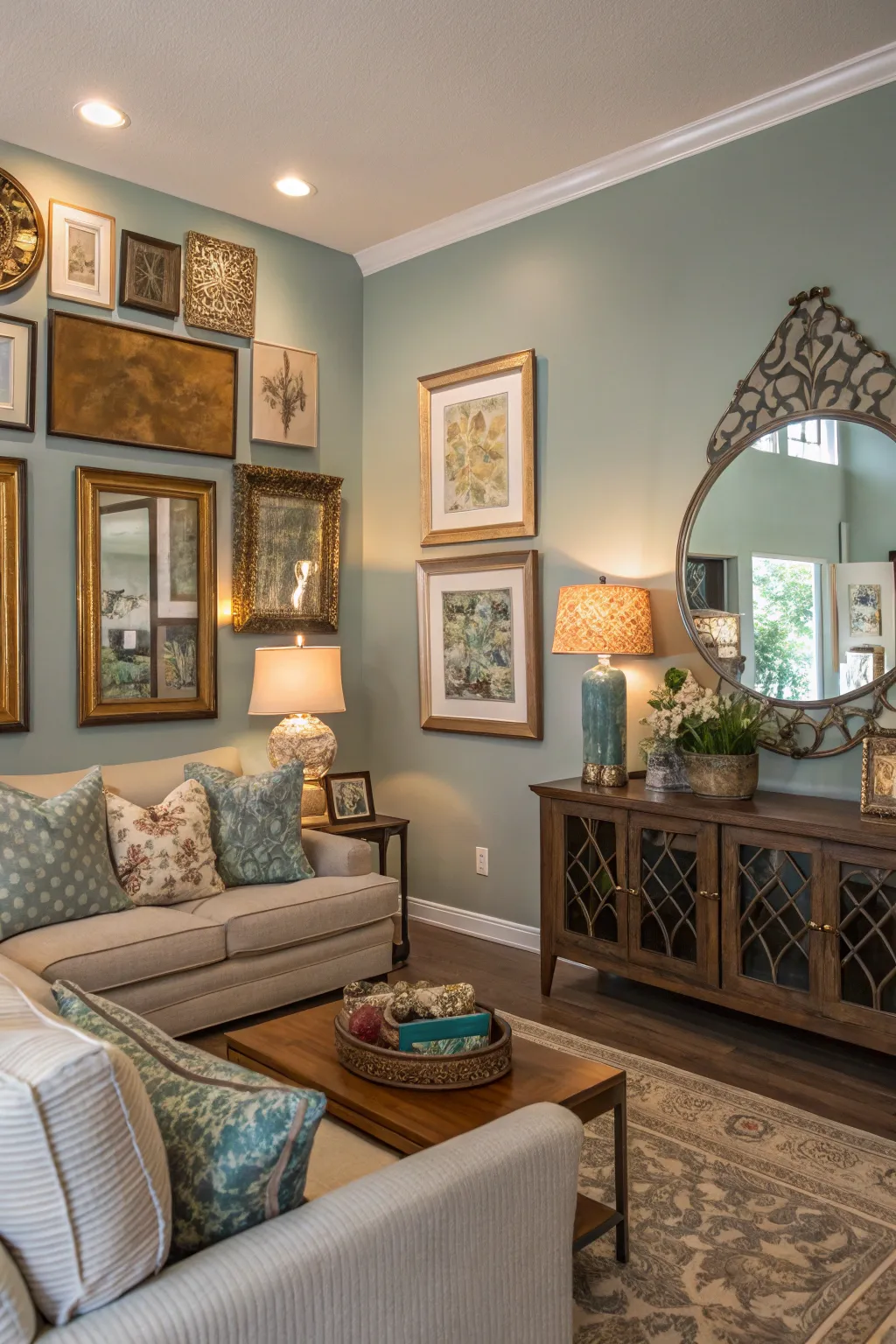 - Ornamental Wall Looking Glass: Bring dimension and light to your living room with an elegant ornamental looking glass.