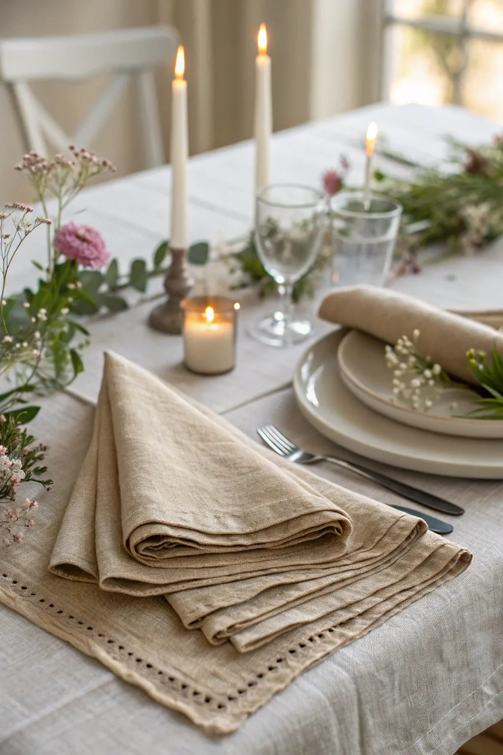 - Subtle Patterned Linen Centerpiece: With a linen runner that combines design and a hint of texture, you can enhance your dining experience. These are an absolute must for dinner parties!