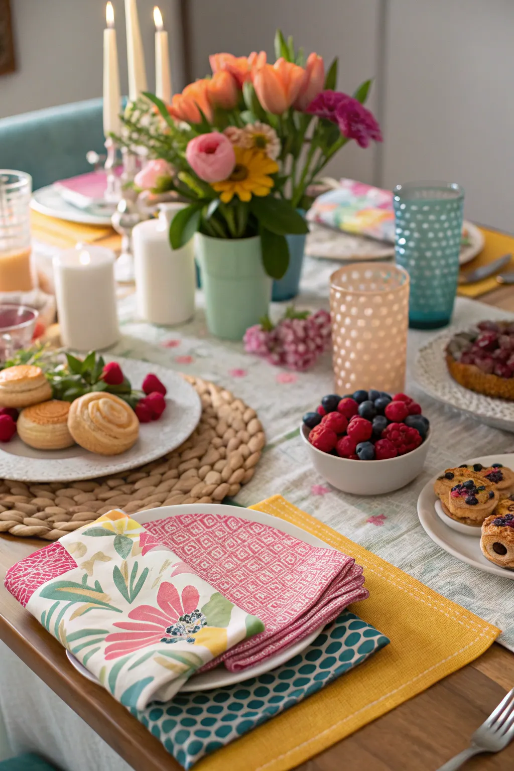 - Vivid Patterned Napery Set: Improve your table’s visual appeal by utilizing lively napery; merge patterns to sculpt an active, varied brunch atmosphere.